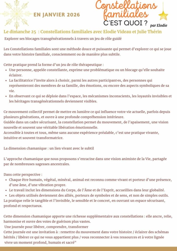 Non classé Constellations Familiales – Dimanche 25 janvier par julie Vauchel|Publié 6 janvier 2026 de 9h30 à 17h30 avec Elodie VIDEAU et Julie THERIN Tarifs : 60€